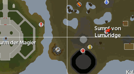 Mysteriöse Ruinen zum Wasserrunenaltar, der zentral im Sumpf von Lumbridge südlich von Lumbridge liegt<br>